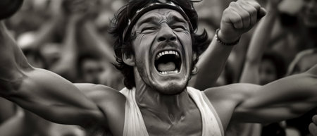 Winning athlete celebrating after crossing the finish line of a marathon, raising his arms and screaming with joy under falling confetti