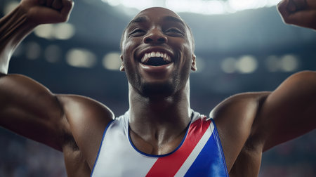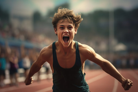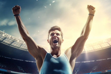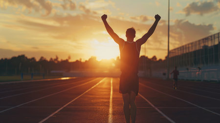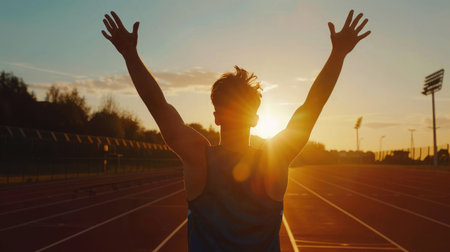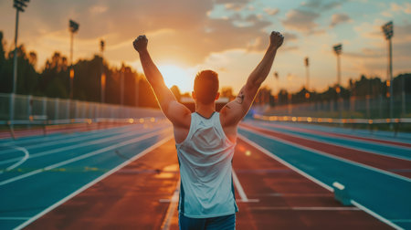 Male athlete stands on a track, arms lifted in celebration against a vibrant sunset, embodying the essence of victory and perseverance in sports, AI generated