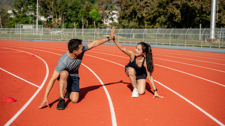 Two Asian runners give high five while getting ready to run on a running track, training at a stadium on a sunny day. people, friendship, and sport concepts