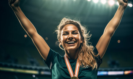 a victorious athlete woman raising their arms in celebration at the finish line of a race triumphal.