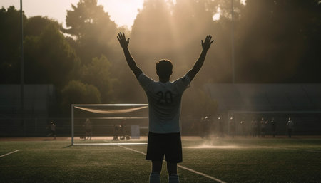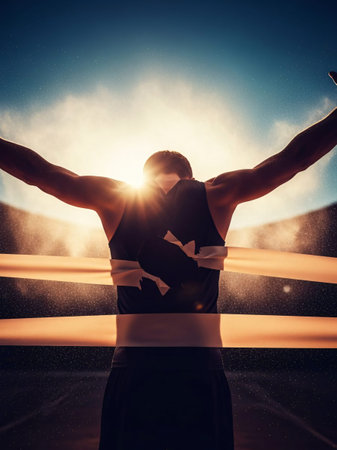 A joyful athlete celebrates a hard-earned victory at sunset, arms raised high, surrounded by an inspiring glowing background, encapsulating pure emotion and triumph.