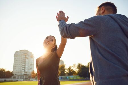 I believe in you. Shot of a young couple giving each other a high-five while standing outside in sportswear.