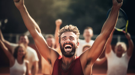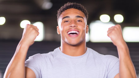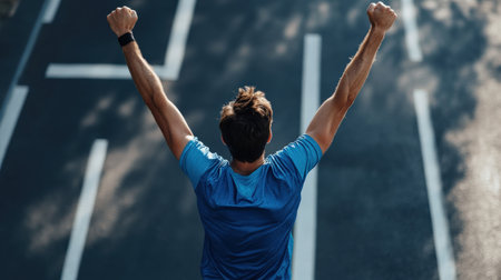 Victorious Male Athlete Triumphantly Reaching His Goal with Hands Held High