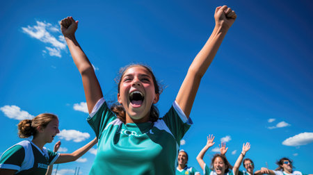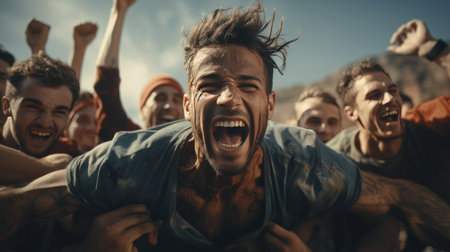 Successful soccer team playing outdoors, cheering with determination and strength generated by artificial intelligence