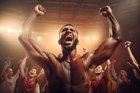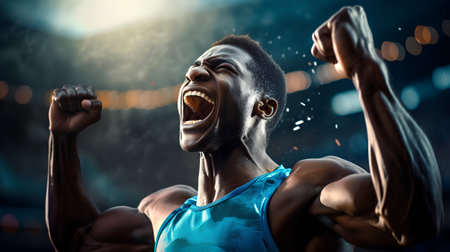 Happy African-American man, athlete with muscular body raising fists upwards in moment of success. Concept of sport, emotions, championship, victory moment