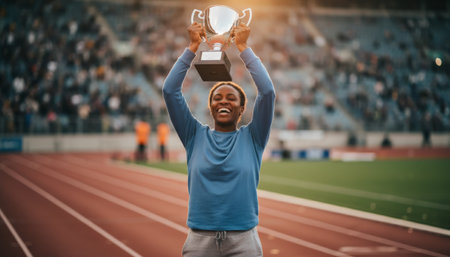 African american woman joyfully celebrating a championship success, raising a shining trophy high above her head on a running track with a blurred stadium audience in the background
