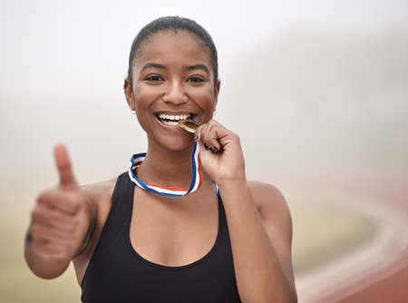 Success sure does taste sweet. Shot of a young female athlete giving the thumbs up while biting her medal.