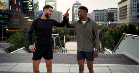 Friends, men and runner with high five outdoor for fitness, exercise or city training during workout. Athlete, people and hands together for team building, happiness and support for running challenge