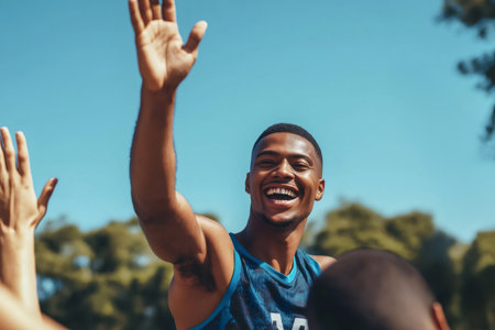 Happy basketball player celebrating sport victory with teammates giving high five outdoors