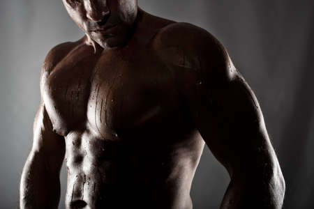 Dark close up studio shoot of strong masculine athletic man. Upper torso and chest. Black and white photo.