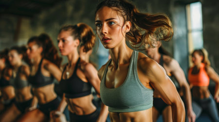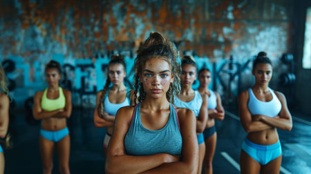 Group of determined young women standing confidently in a gym, dressed in fitness gear, showcasing strength and teamwork in a sporty environment.