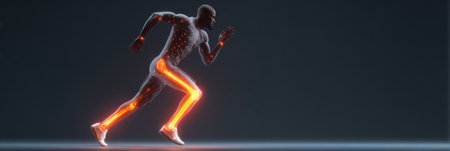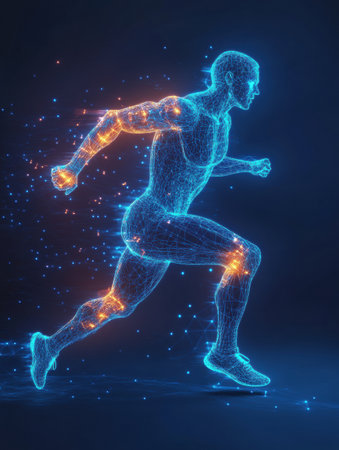 A runner in motion features illuminated muscle lines highlighting strength and energy, set against a dark background to emphasize speed and athleticism.