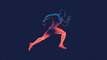 Dynamic anatomical visualization of a human figure in motion, highlighting joints and muscles with vibrant energy.