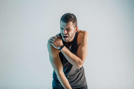 Exhausted young sportsman feeling pain in shoulder