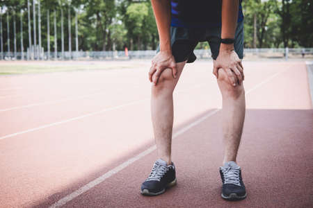 Young fitness athlete man have a rest during and tired on road track, exercise workout wellness concept.