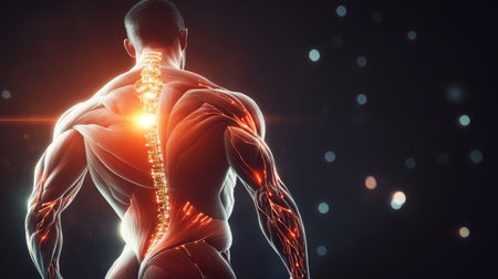 Stunning portrayal of back muscular anatomy, showing muscle fibers and spine, with soft lighting to highlight details.