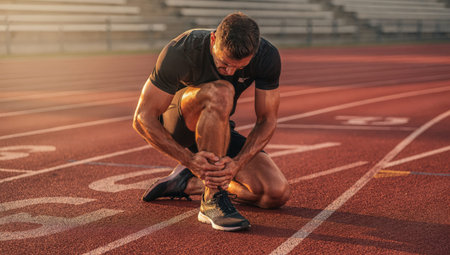 Professional male athlete sitting on a red running track grimacing in pain as he holds his injured ankle after a training session symbolizing the challenges and resilience in high-performance sports.