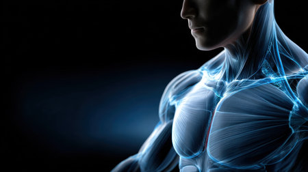 A man's chest and shoulders are shown in a blue and white color scheme. The image is a representation of the human body and its muscles. The blue and white colors give the image a futuristic