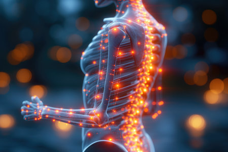 Muscular anatomy with glowing spine detail illuminated in a dark background against stars