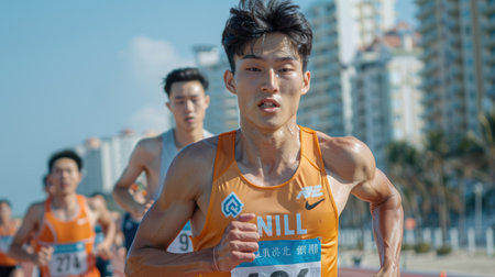 Focused athletes compete in an intense sprint race, highlighting their determination, speed, and competitive spirit. Muscular runners in action capture the essence of strength, stamina, and athletic excellence in a dynamic sports setting.