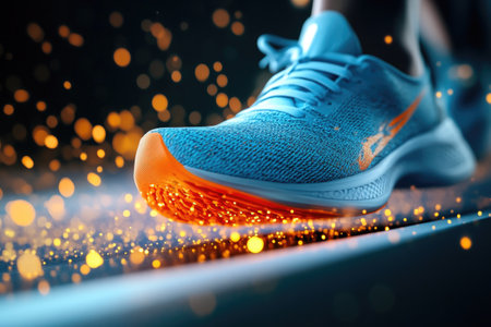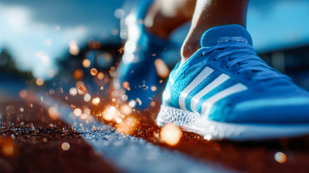 Close-up of running shoes hitting the track with energy and sparks, symbolizing speed and athletic performance.