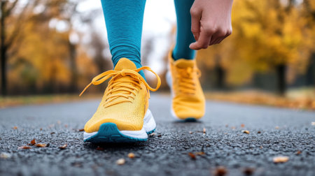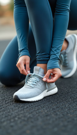 Close-up of hand tying shoelaces ready to run on the road.Gray sports sneakers on the background of the road.