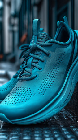 Blue running shoes on the street. Sport and healthy lifestyle concept.