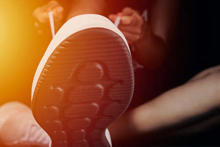 Woman hands tying shoelaces on sneakers on a dark background. Fitness athlete ready for exercise