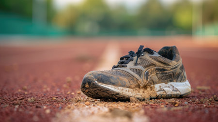 Fitness Brand Banner: Running Shoes on Outdoor Track at Sunrise for Inspirational Design