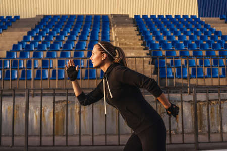 Strong athletic woman sprinter, running on stadium wearing in sportswear. Fitness and sport motivation. Runner concept.