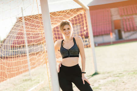 Fitness girl lying on the grass of a football field