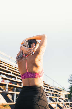 young active sport woman seen from the back stretching and turning her face to the sunset beside of the running track