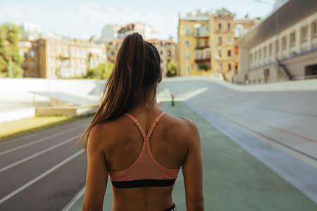 Young, beautiful girl athlete in sportswear is training and running, stretching at the stadium