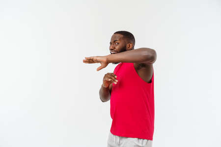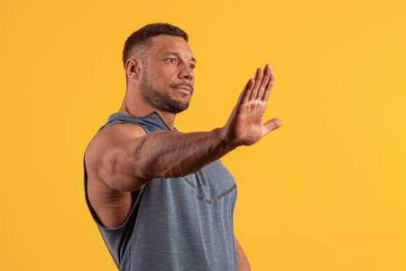 Sporty strong man stretching arm before gym workout on colorful background. Fitness strong male athlete standing indoor warming up.