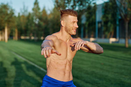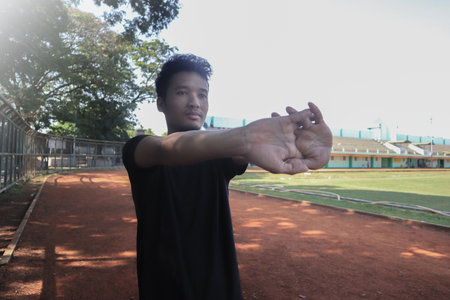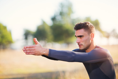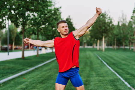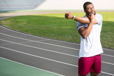 Upper-body exercise. Calm young muscular man standing at the stadium while stretching his arms and looking in front of him