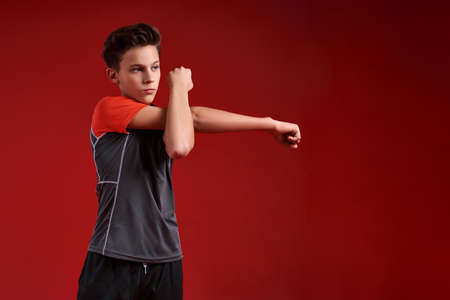 A teenage boy is engaged in fitness, he is looking aside while doing exercise. Isolated on red background. Sport, training, fitness, active lifestyle concept. Horizontal shot