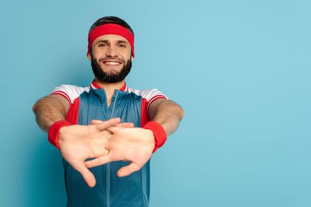 Portrait of a young bearded athlete of twenty-five, jumping against a blue sky.