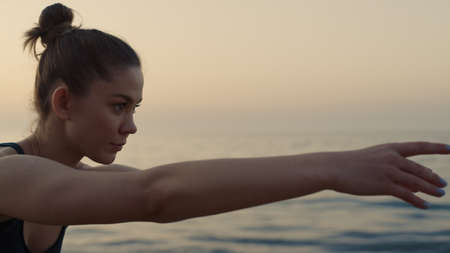 Focused girl reaching hands forward practicing yoga asana on seacoast. Sporty woman standing warrior pose near beautiful ocean. Attractive young sportswoman training on nature. Wellness concept.