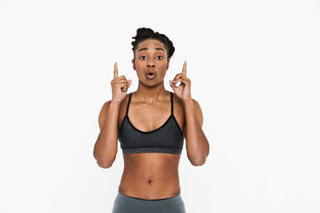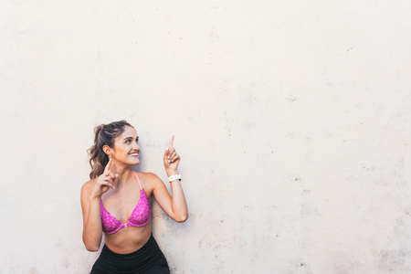 Beautiful and smiling caucasian young active woman pointing to a copy space. Sport and healthy life concept.