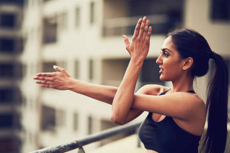 A man is stretching his arm in front of a fence. Concept of determination and focus as the man works on his flexibility
