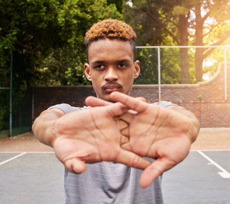 Sports, basketball and man stretching on court for competition, training or fitness games. Face of serious male athlete, player and warm up arms for workout, thinking of performance action or contest