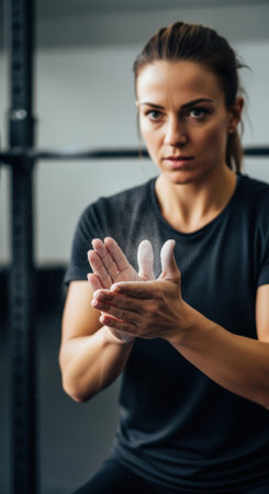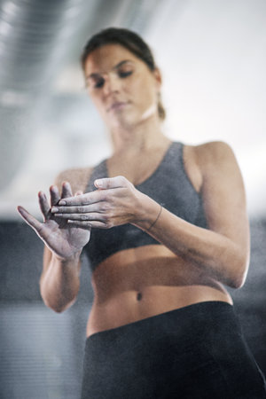 Determined athletic woman preparing for intense gym workout, rubbing chalk on hands before weightlifting session.