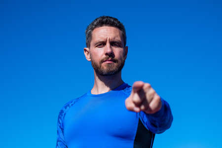 confident sportsman in sportswear pointing finger on sky background, fitness trainer