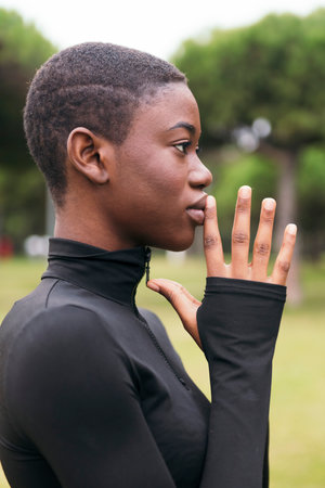 Serious young Black sportsman raising arms and looking away after training outdoors
