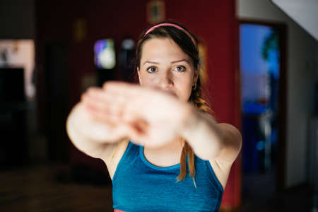 Fitness woman stretching hands on blue sky background. She does exercises after running. healthy lifestyle concept.