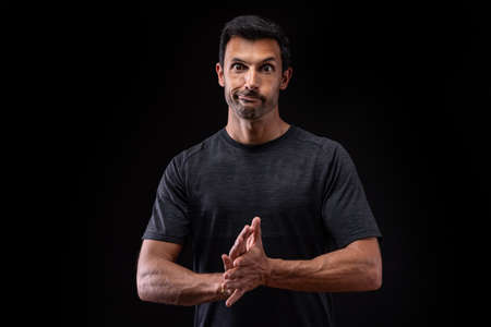 The athlete man, grimaces, builds facial expressions, on a black background. Extreme human emotions. High quality photo
