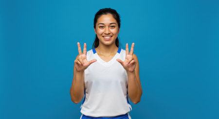 Smiling young woman in basketball attire displays three fingers on each hand against a clean blue backdrop. Positive, energetic studio shot perfect for various campaigns.