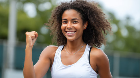 A joyful tennis player celebrates a hard-fought victory on the court during a vibrant match in the afternoon sun. Generative AI
