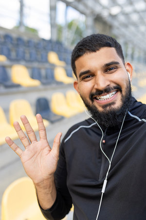 Cheerful bearded man with headphones waving and smiling at the camera, seated in a sunny sports stadium with yellow seats.