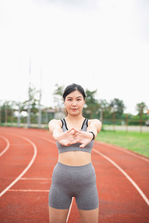 Young Asian woman stretching on athletic track, preparing for workout, wearing sportswear, focusing on fitness and athletic training outdoors